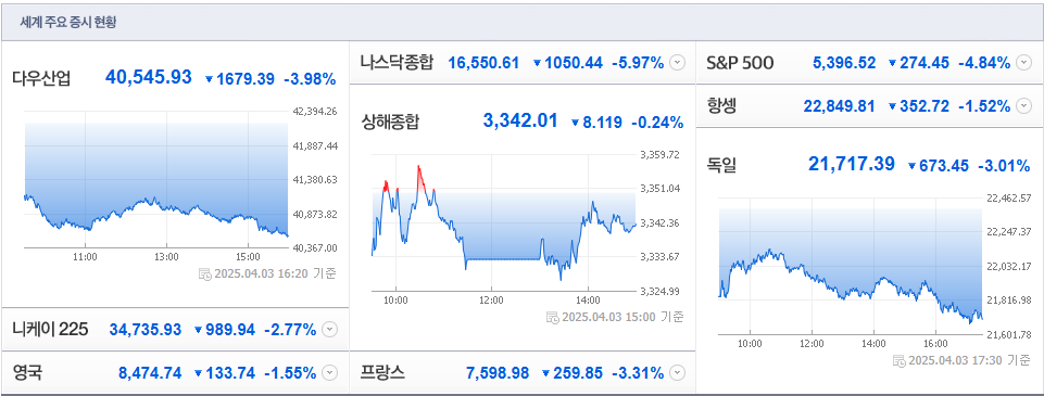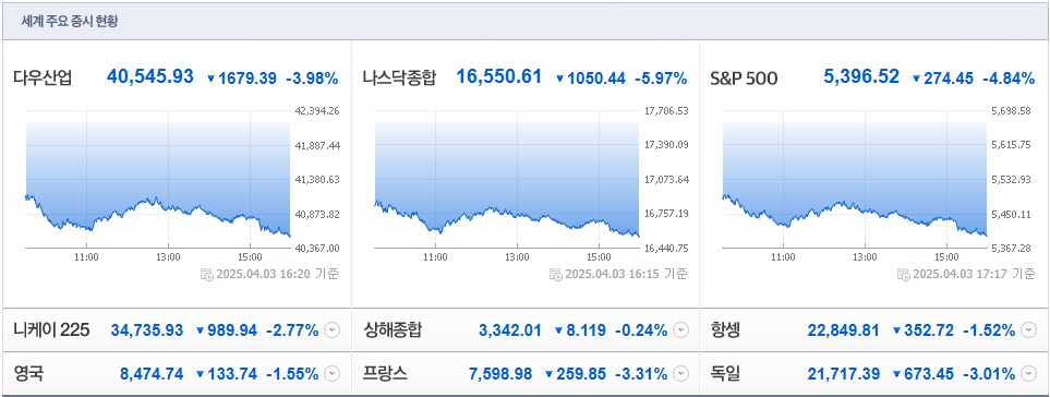 | 다우존스 산업평균지수 | -1,679.39pt (-3.98%) | 40,545.93 |